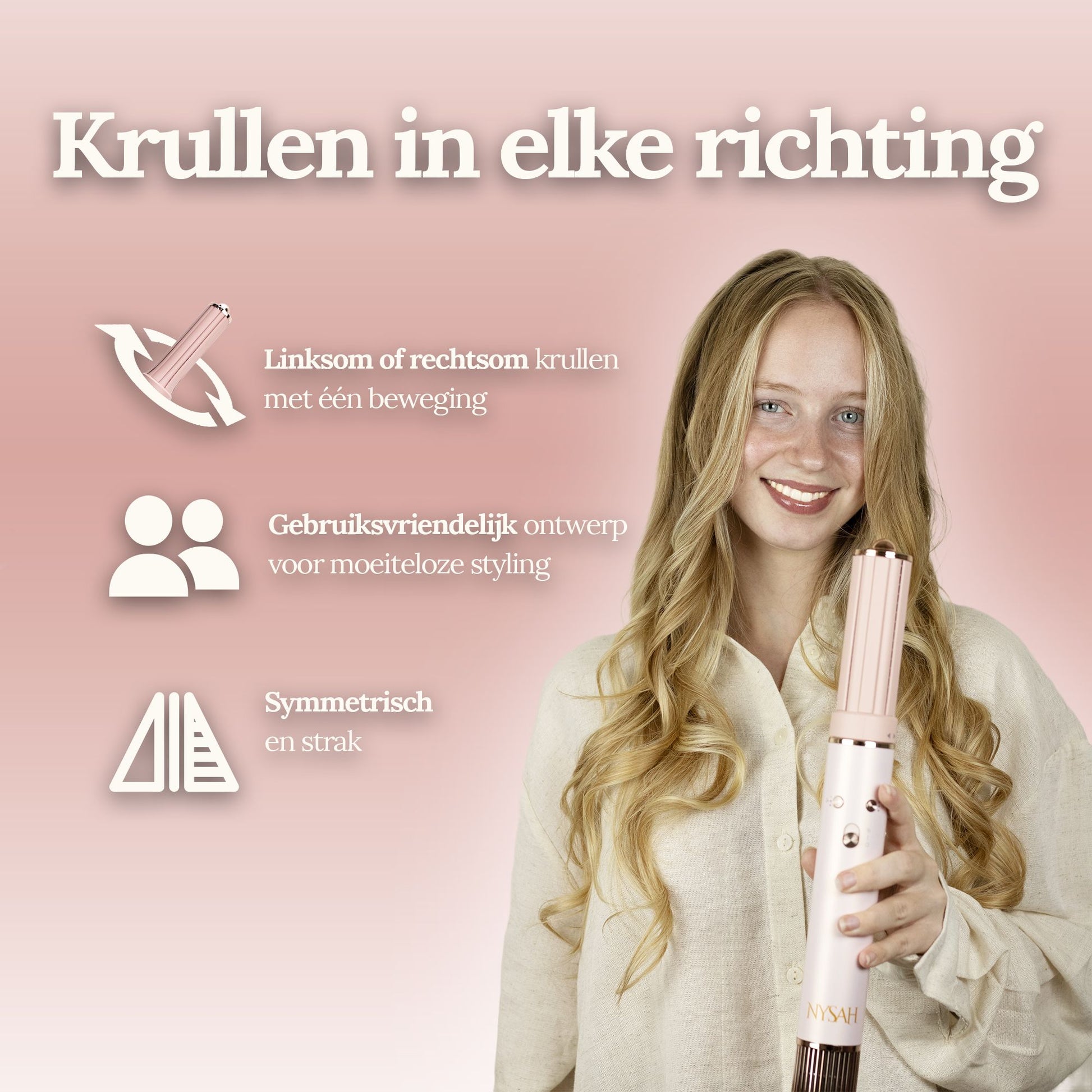 Ontdek de luxe Nysah® PRO Airstyler Pink: een multistyler die je haar transformeert zonder schade of gedoe. Van elegante blowouts tot bouncy krullen of strak steil haar – met één tool creëer je elke look.